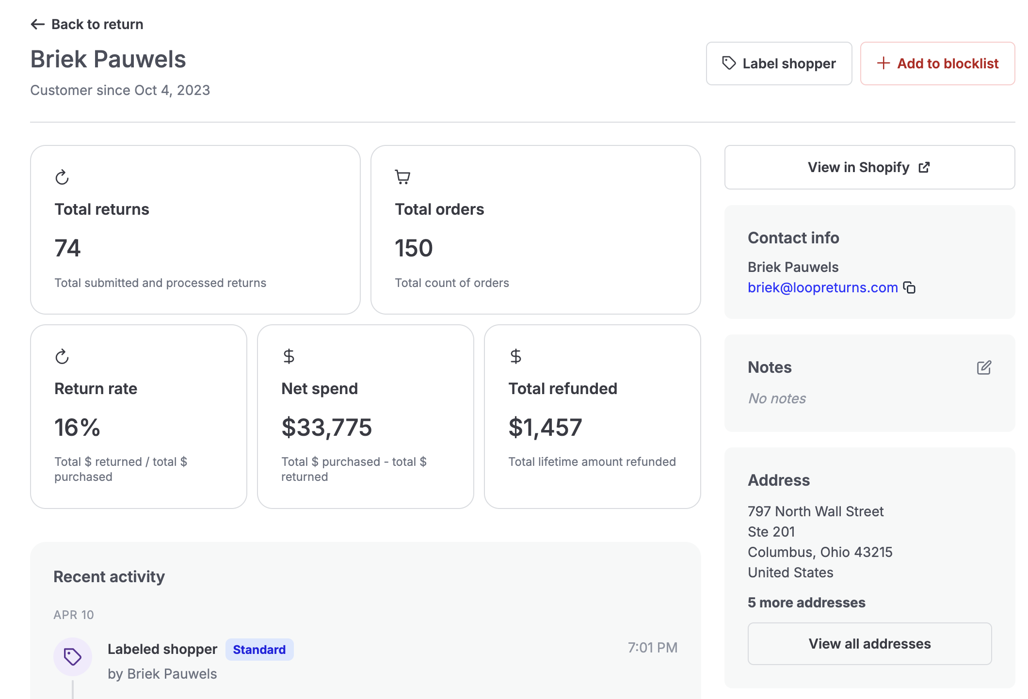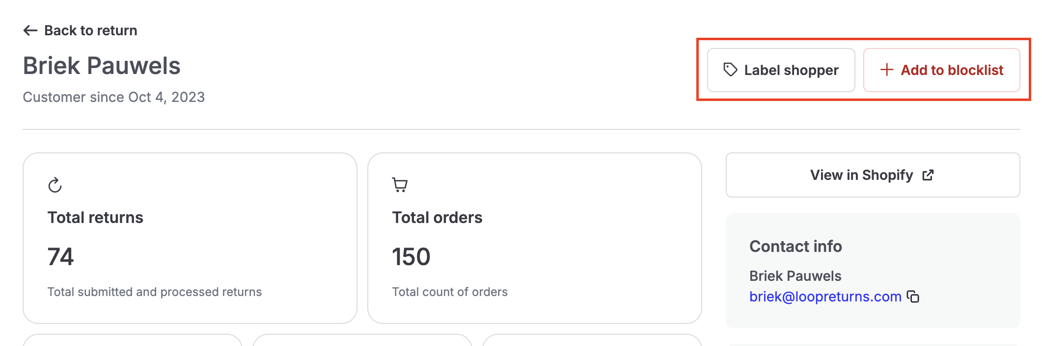Shopper Insights gives merchants visibility into the shopper behind a return. This article explains how to use this feature to make faster, more confident decisions on returns that require attention. All shopper data is scoped to your store — no cross-merchant data is surfaced.