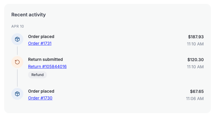 The shopper page also includes a timeline of the shopper's full history with your store. The timeline replaces the previous "View return history" link on the return detail page.