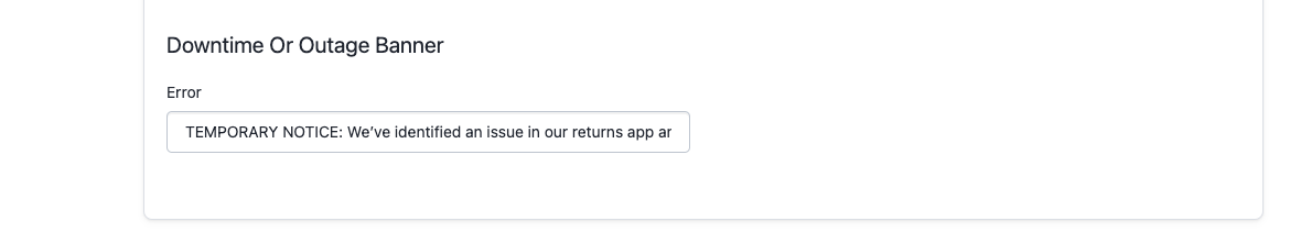 Downtime banner verbiage can be updated by navigating to Returns management > Shopper experience > Portal customizations > Edit All Content > Global.