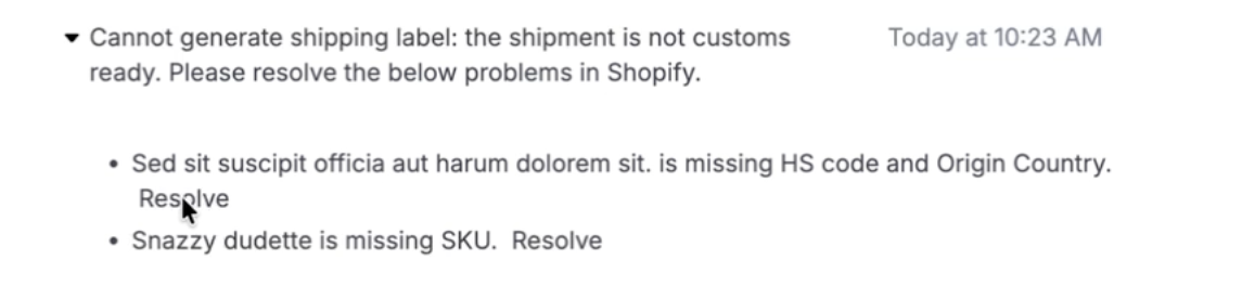 Important: This information must be present for all products! If this information is not present, the label will fail to create and an error message will populate. You can click "resolve" to add the missing data for this return and any we store it for future returns where this is missing on the product.Click Save.