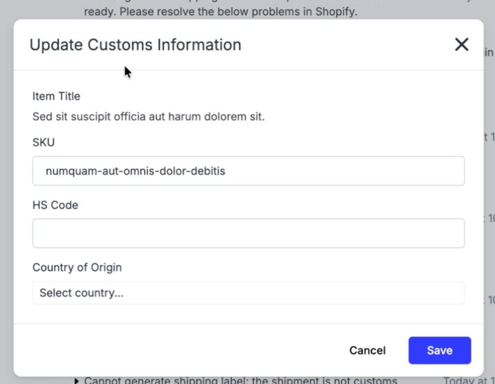 Note: If there are any non-physical products available in the store (i.e., package protection), those products need to either a) have the HS code and country of origin fields applied, or b) have the requires_shipping field in Shopify set to "False".