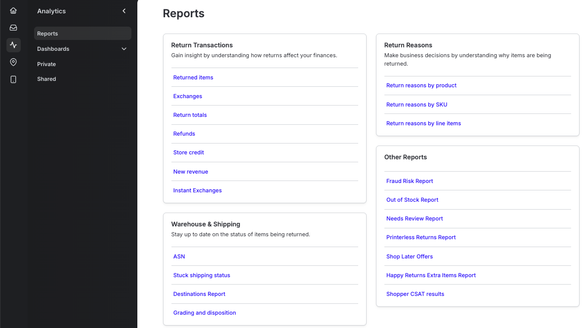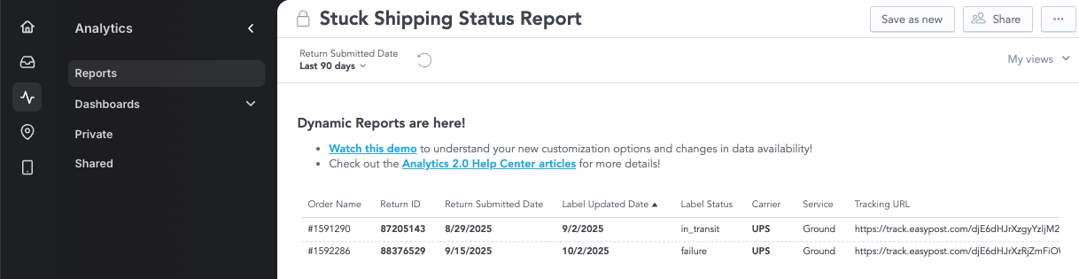 If merchants do not have adequate visibility into returns that have failed to receive shipping updates from the carrier, it can cause delays in effectively resolving stuck returns in a timely manner. Which is why we’re happy to roll out this report!