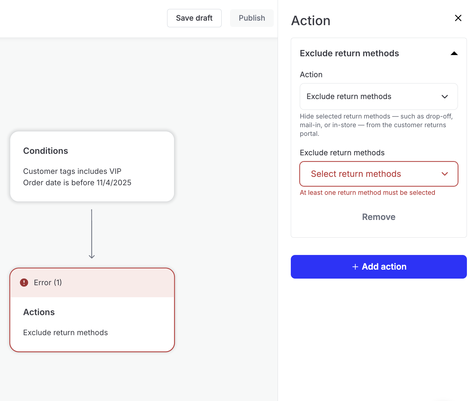 If needed, merchants can stack multiple conditions together to further narrow down which returns qualify for a given action.