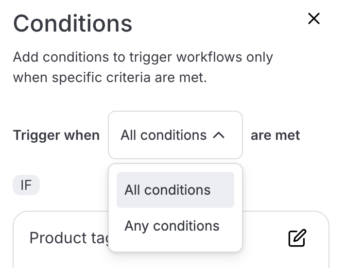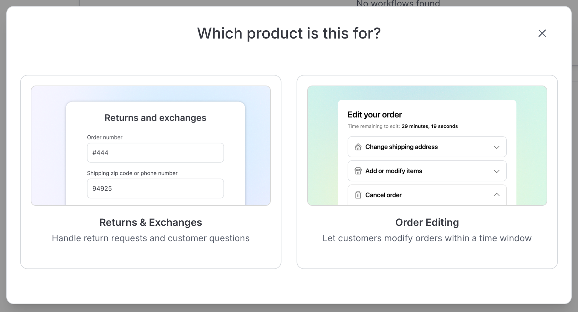 Note: This component currently comes pre-selected, and is based on the feature that the workflow is being built for. The two options today are: Returns, and Order Editing. In the future, this component will be configurable by merchants, and will include more granular trigger events.