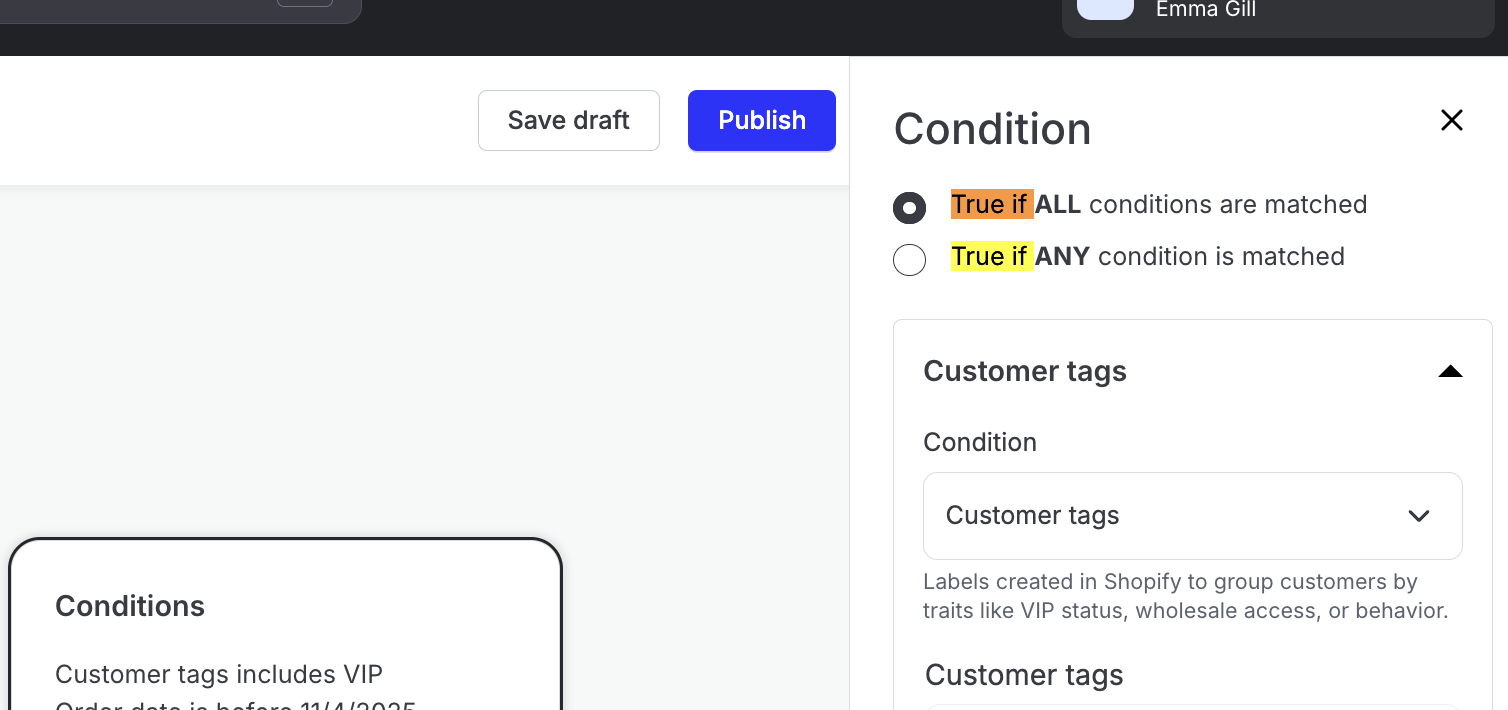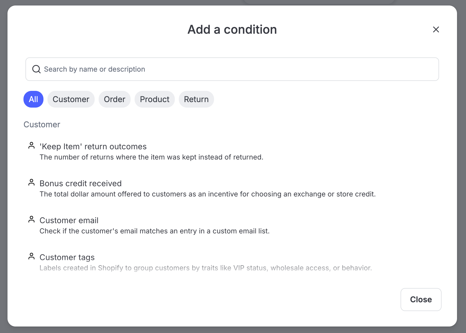 Customer conditions - Customer conditions target a specific customer. Some examples include customer tag, number of orders, and return count.