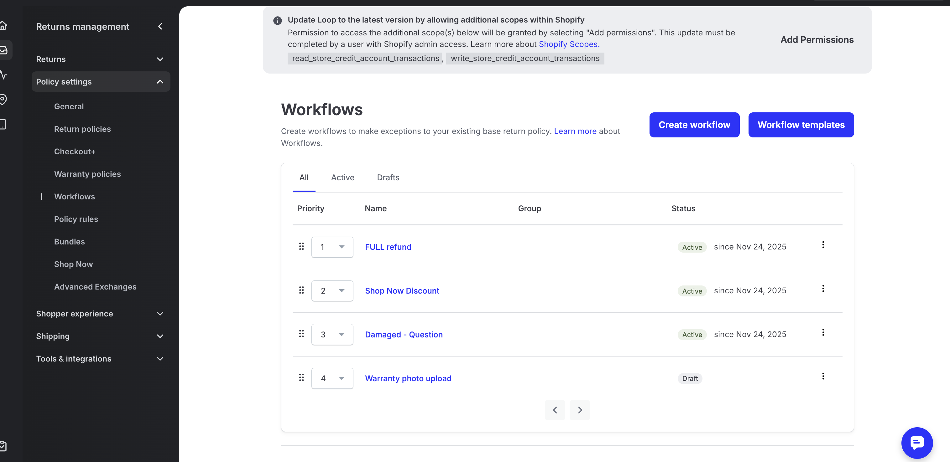 In the Loop admin, go to Returns management > Policy settings > Workflows. There, merchants can access the list view with all existing workflows. Merchants can also filter the view to show only draft or only active workflows.