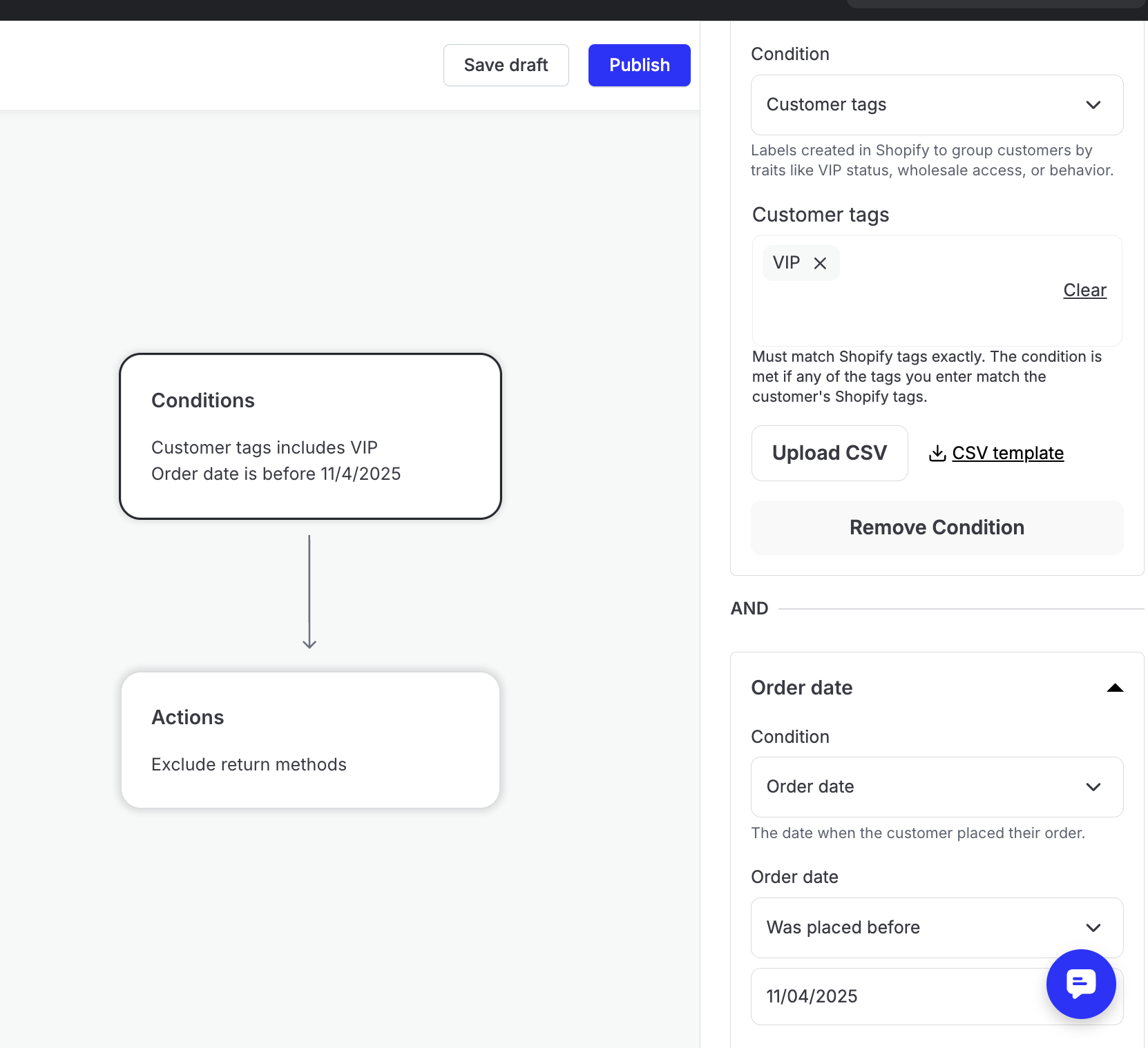 Once inside a template, merchants can configure each component of the workflow. Depending on the template selected, this may include setting conditions, questions, and actions.