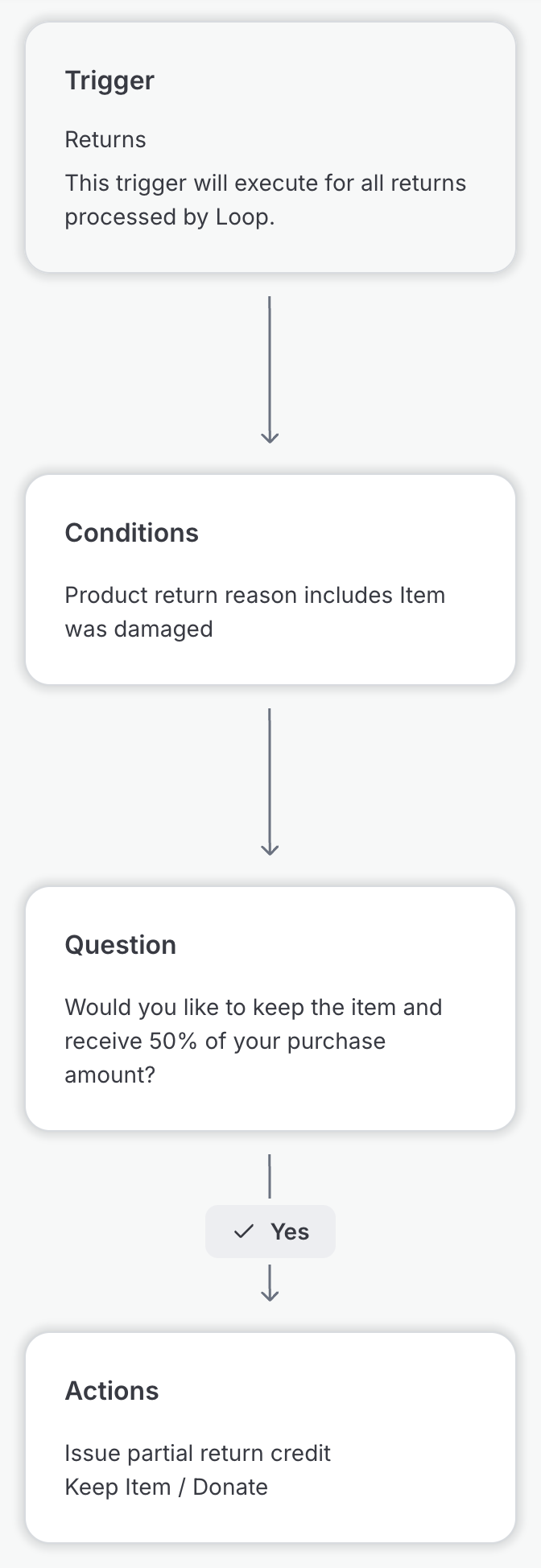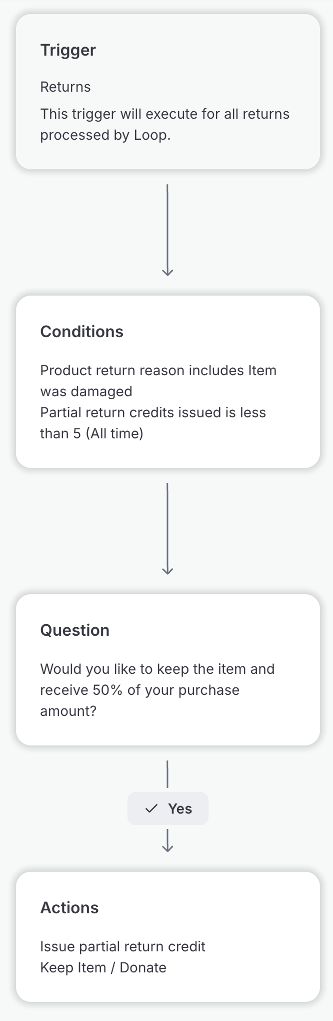 Ask a question: "Would you like to keep the item and receive X% of your purchase amount?" If yes > Action 1: Partial Return Credit (X%) and Action 2: Keep Item.