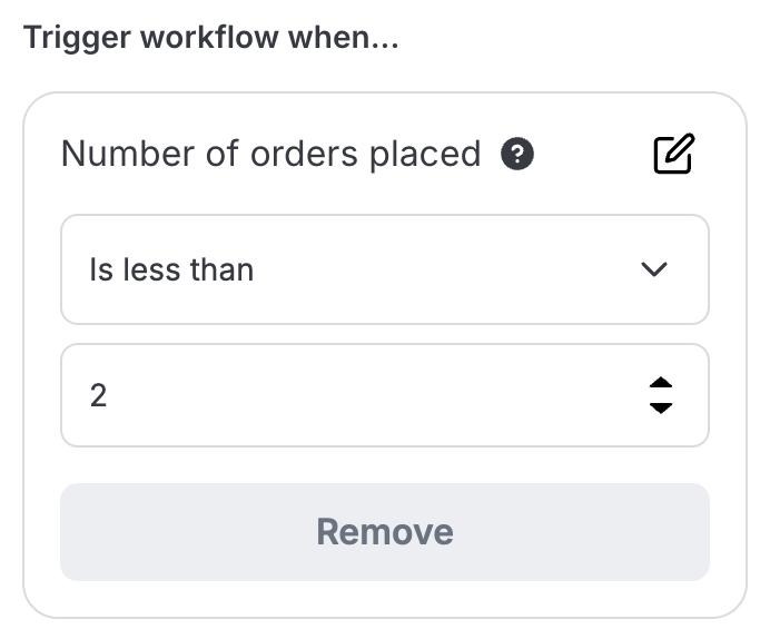 If the merchant wants to target a customer on their first order, the customer order count will be "1," meaning that the merchant must set the condition to "Customer - Number of orders placed" is less than "2". Less than "1" would indicate that the customer has never ordered before, and less than "0" is impossible in this case.