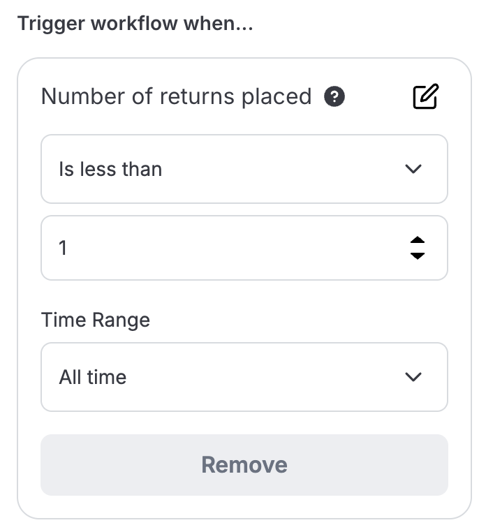 If a merchant wants to offer Keep Item to a customer on their first return, the condition must be "Customer - Number of returns placed" is less than "1". At the time the customer is creating their first return, their return count is technically "0"; a "less than 2" condition would indicate that the customer will be able to keep their second return, as well.