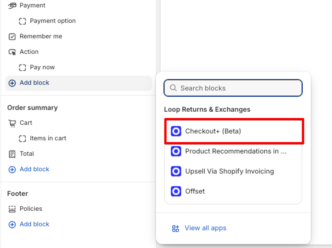 Select the Checkout+ app block under Loop Returns & Exchanges to add to checkout section.