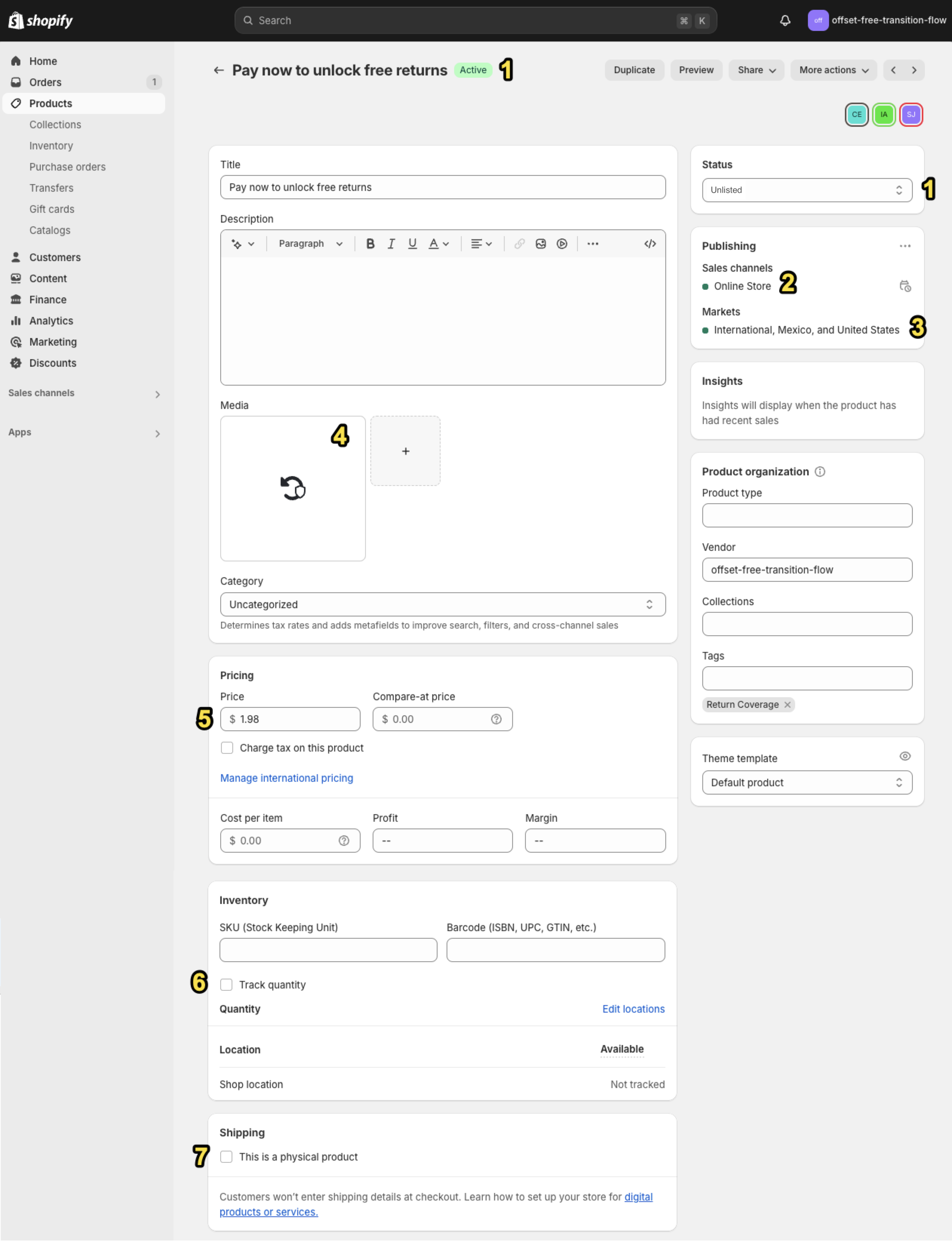 Product Status should be Unlisted. This ensures that the product listing does not show in your Shopify storefront.