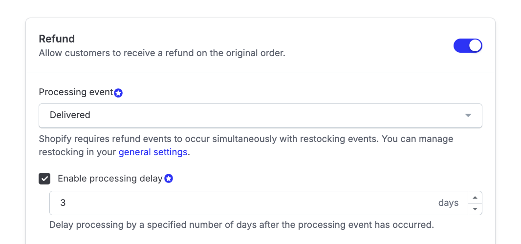 During the holidays, warehouses can be super busy and take longer to process returns than usual. As a result, you can configure it so that Loop waits a few days until processing the return so that the warehouse has adequate time to return the item to stock or QA. This works best for merchants with processing events set to delivered.