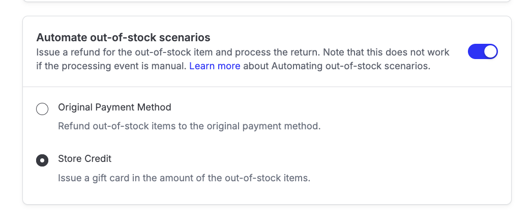During the holiday season, products can sell out faster than usual. Which means that more out-of-stock (OOS) errors can pop up. By automating OOS returns, the outcome can be converted from exchange to store credit or refund automatically. This will save time for your CX team and get the customer their outcome faster.