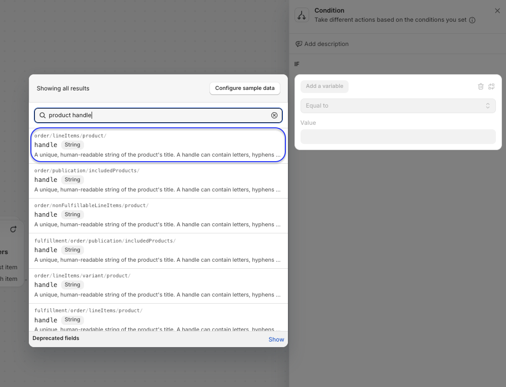 Click Add a variable, then search for product handle and select order/lineItems/product/ handle (String).