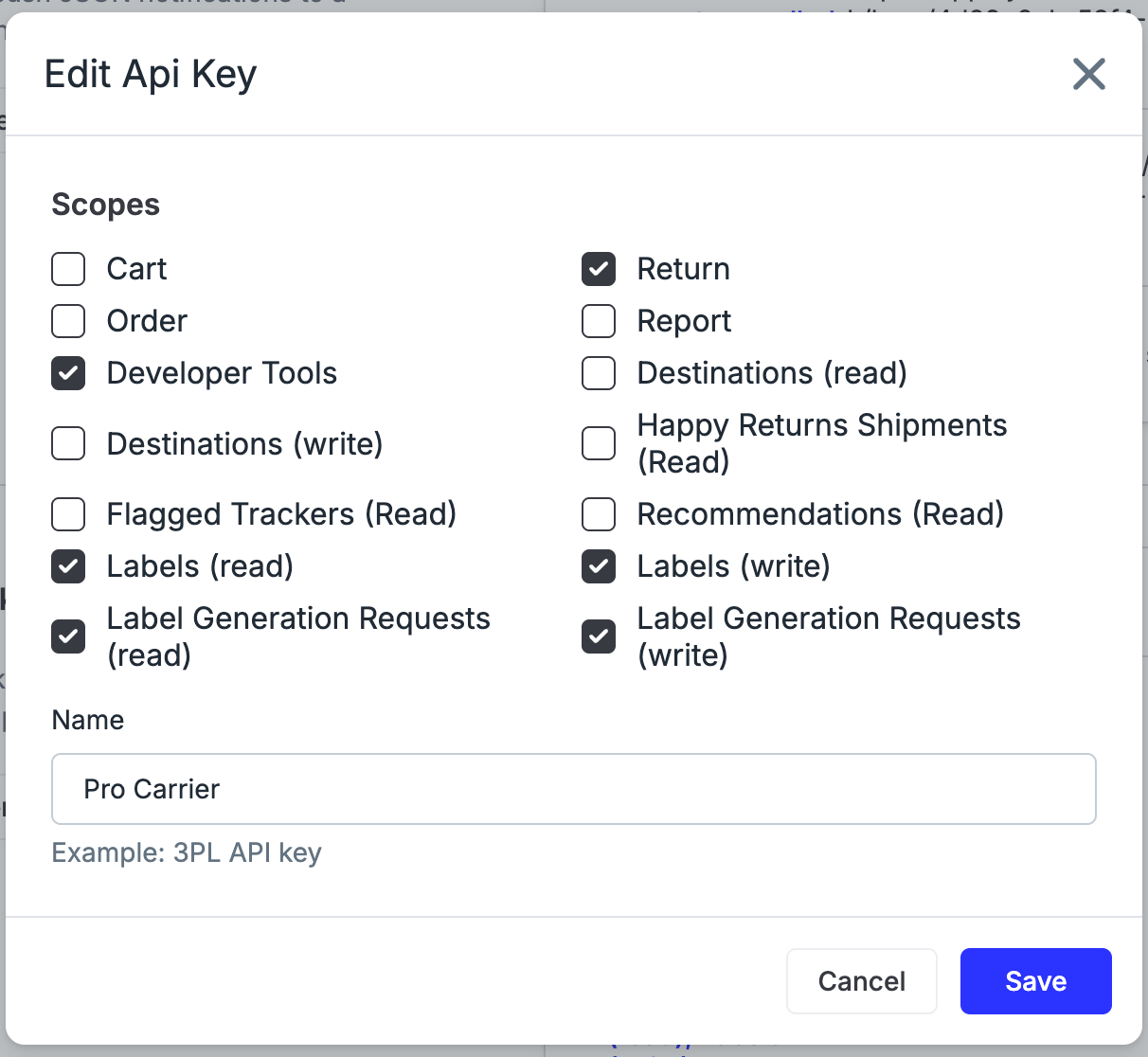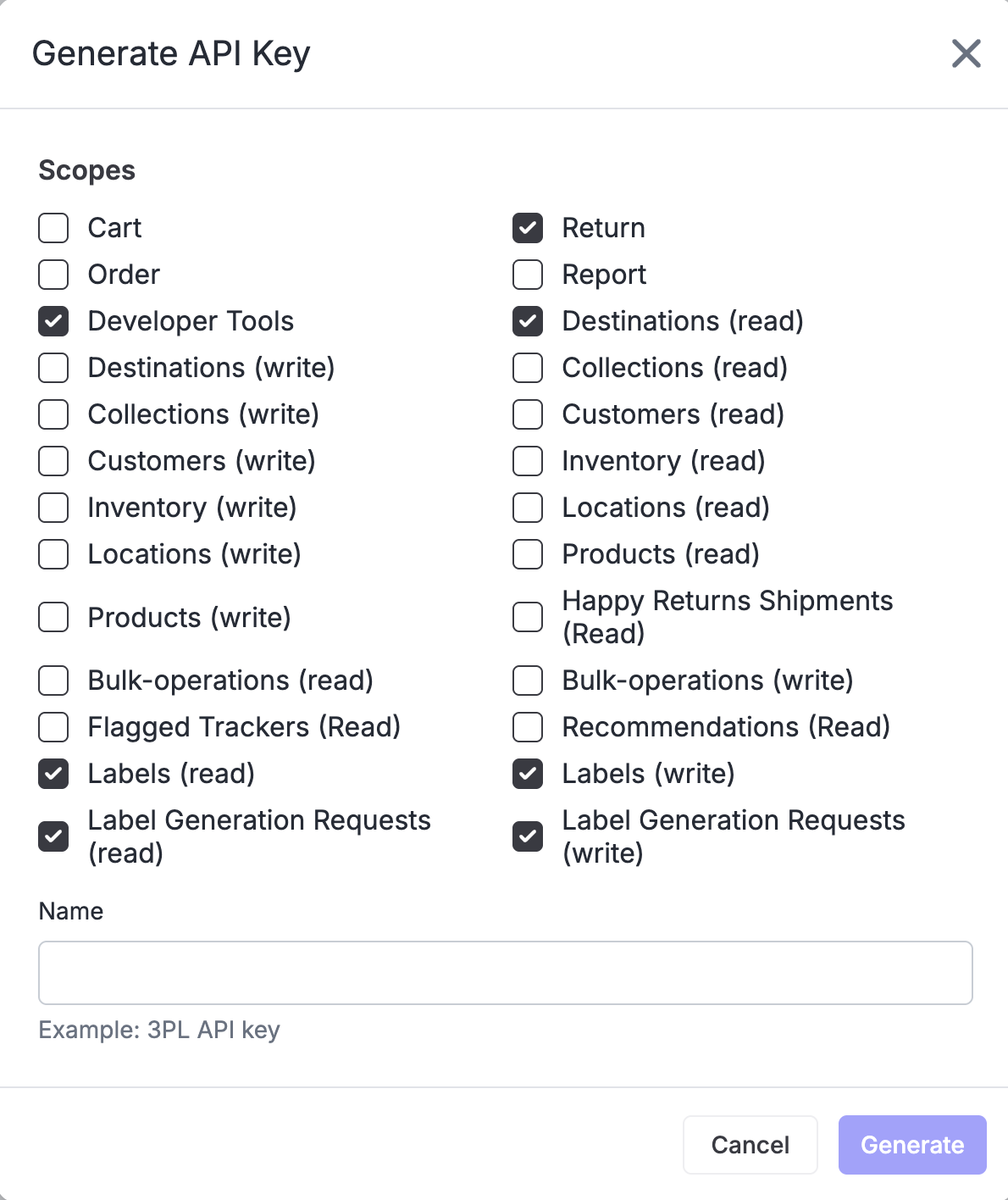 Select the scopes listed below and name the API key “Pro Carrier integration,” This name is for your own internal labeling convenience. Click Generate to create a Loop API key. Note: you’ll need to copy & paste this API key in a later step