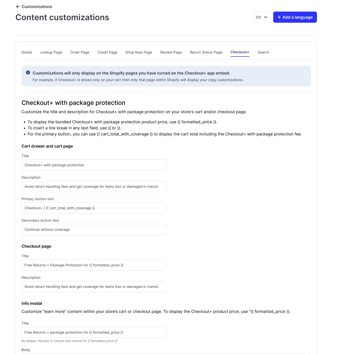 The texts fields on this page are shown to the shopper when they're on the merchant's cart and checkout pages. Customize them to include language around package protection.