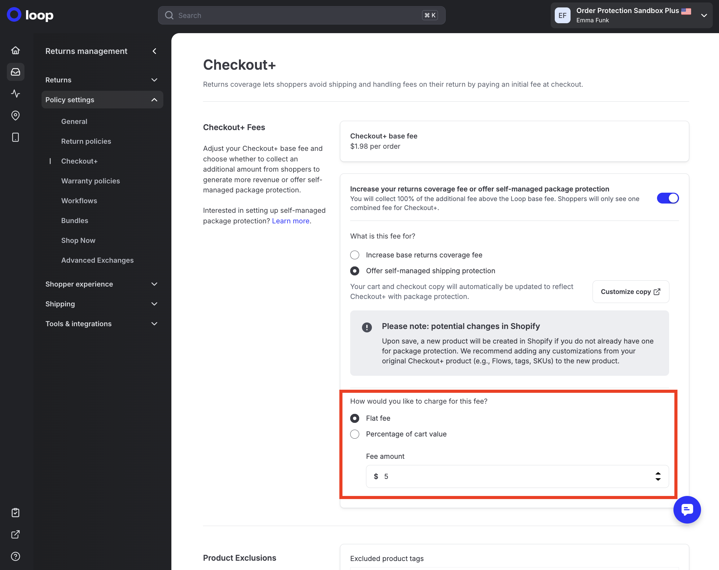Determine the amount you would like to collect for package protection. To determine the cost, we recommend considering factors such as the cost of returns coverage fee, your average order value, and historical loss/damage rates.