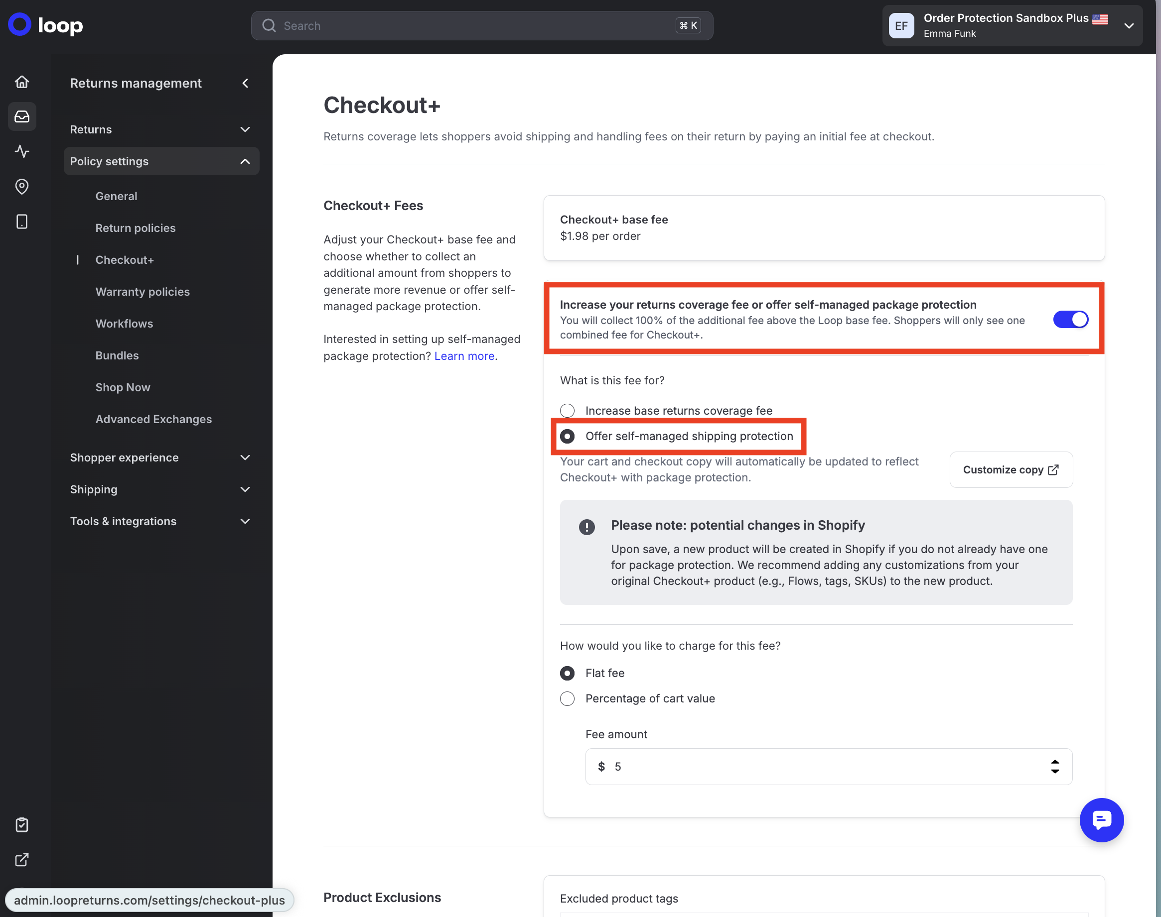 This article explains Self-Managed Package Protection, which allows merchants using Checkout+ to collect package protection funds directly and manage their own claims process for lost, stolen, or damaged packages. It covers how funds are collected when shoppers add the Checkout+ product to their cart, the merchant's responsibility for reviewing and approving claims, and setup instructions for updating the Checkout+ product price in Shopify and customizing the copy in Loop Admin to include package protection language.