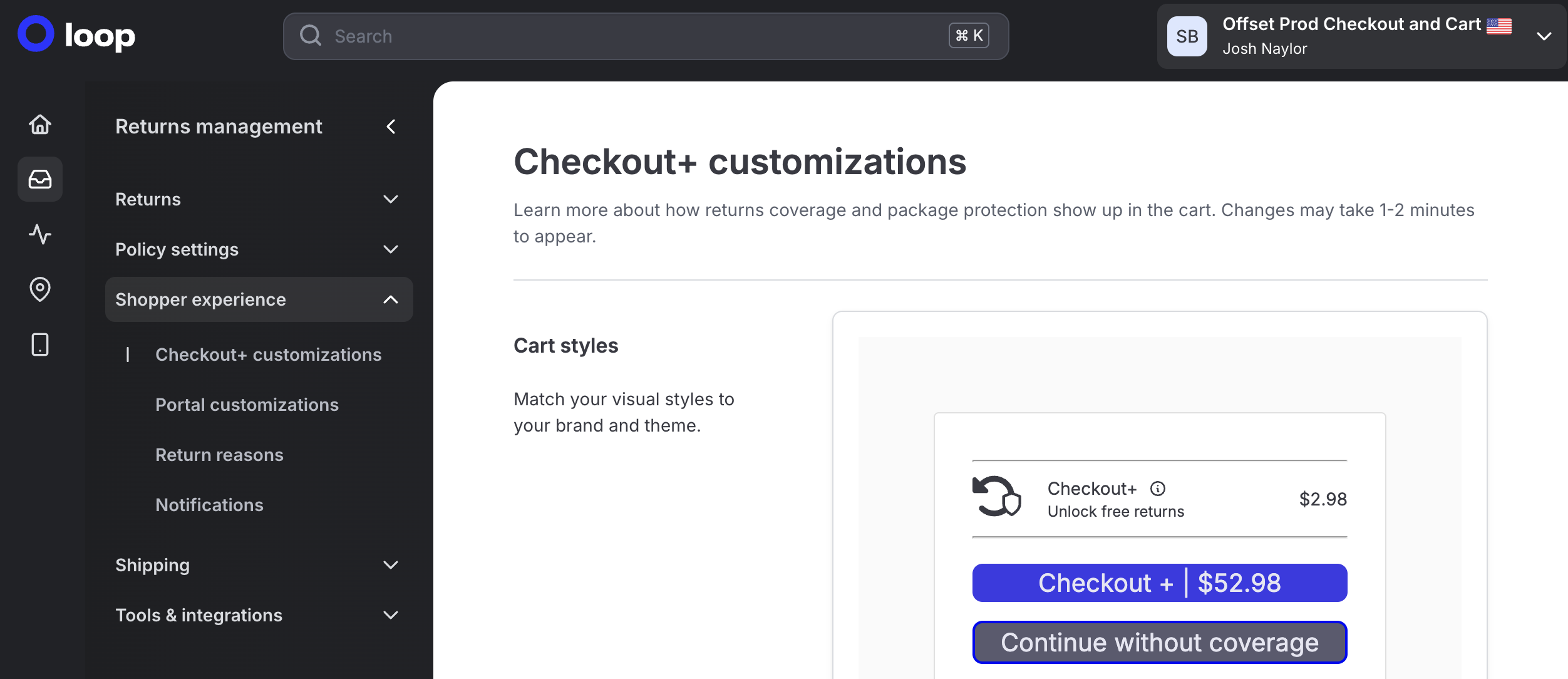 In the Loop admin, navigate to Returns management > Shopper experience > Checkout+ customizations.