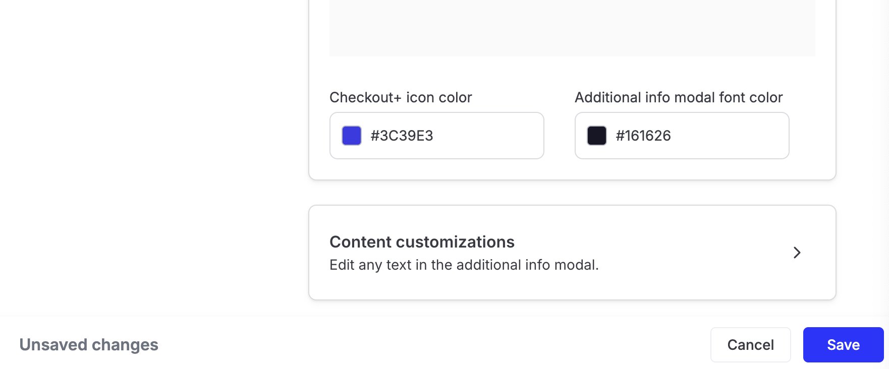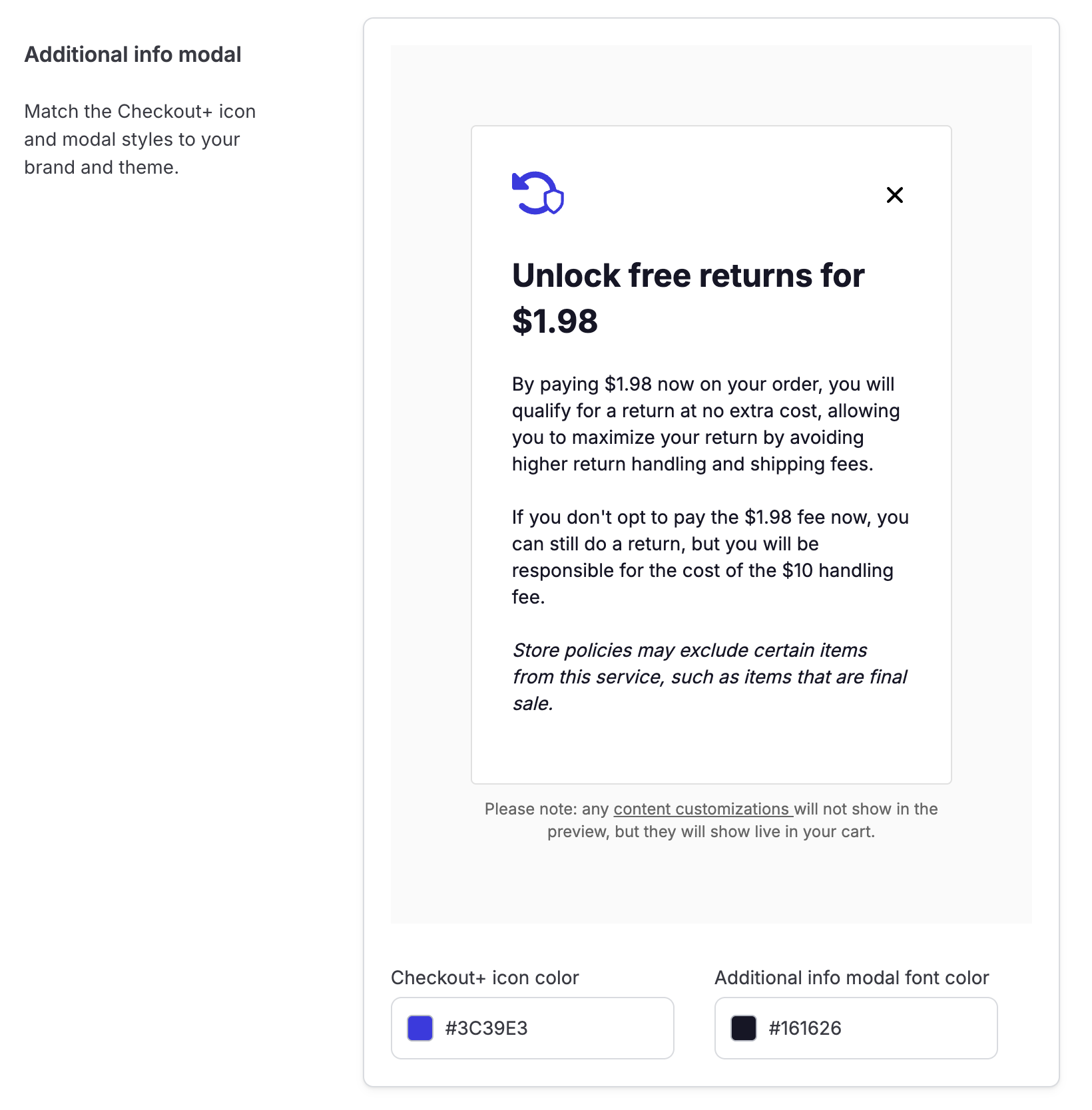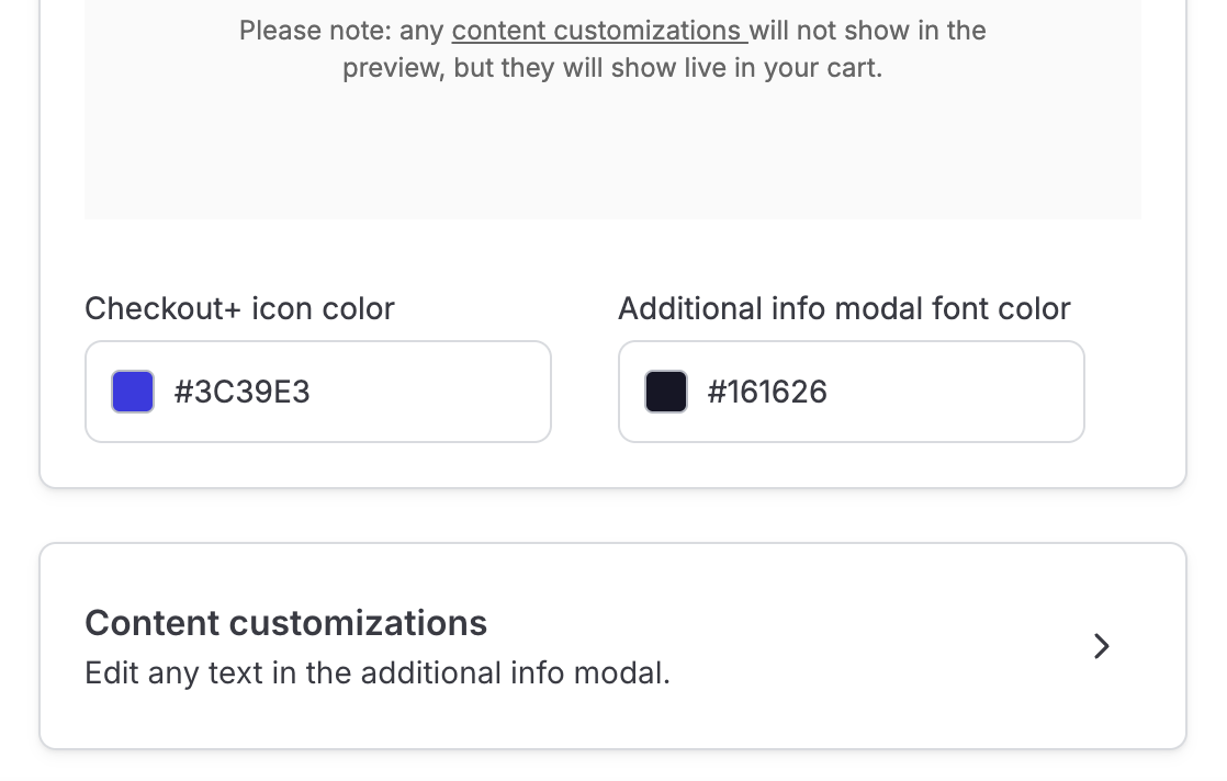 Merchants can adjust the appearance and text of the Checkout+ cart and additional information modal on the Checkout+ customizations screen.
