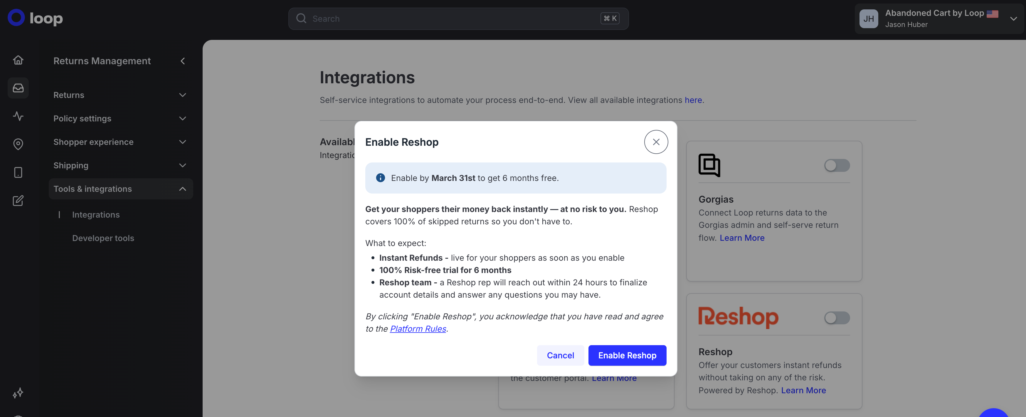 To get started with the Reshop integration, merchants can simply toggle on Reshop in the Integration section of Loop admin.