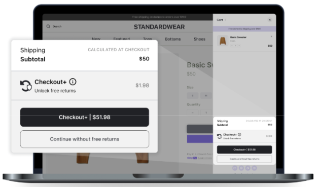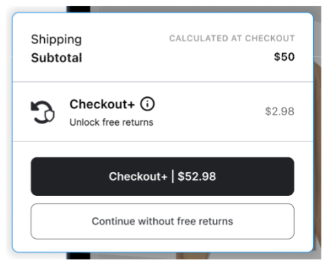 During the initial purchase on your store, customers will have the opportunity to pay to unlock free returns for a small fee through the Checkout+ flow. Free returns will then be added to their order as if it’s any other product from the store.