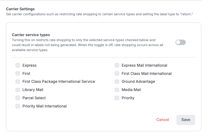 Note: When specific service types are selected, rate shopping is restricted to only those service types, which could result in labels not being generated if none of the selected types are available. When no service types are selected, Loop rate shops across all available service types for that carrier.