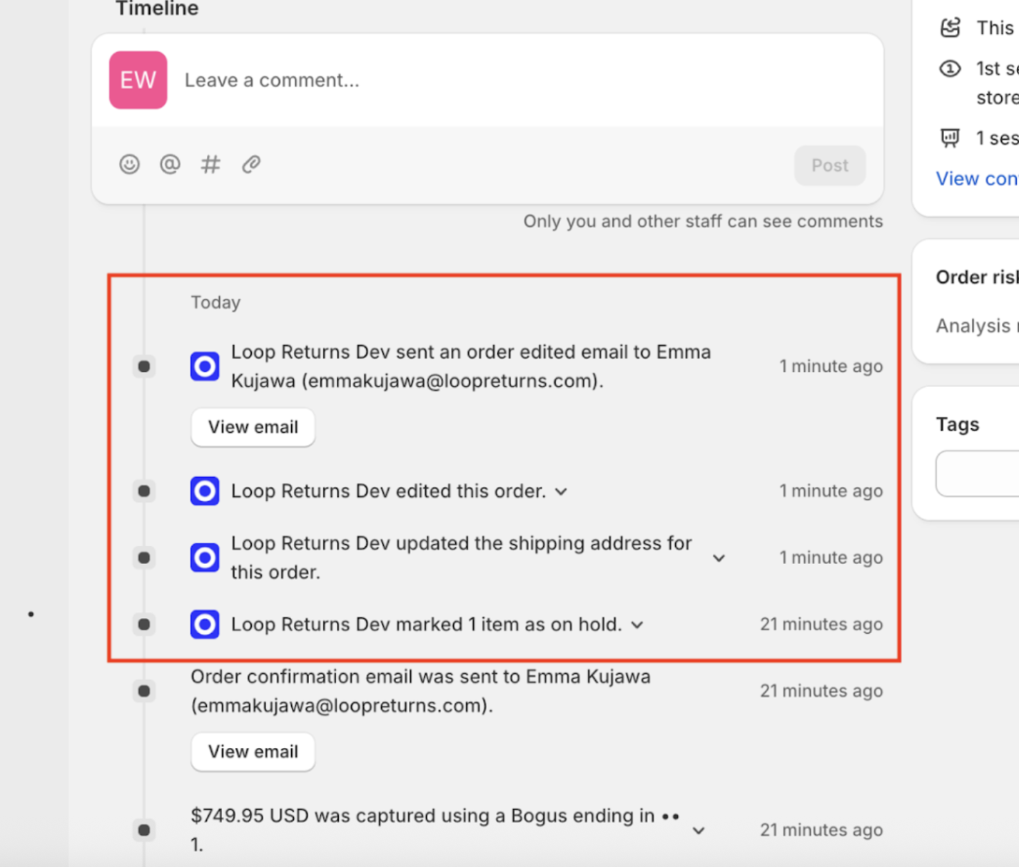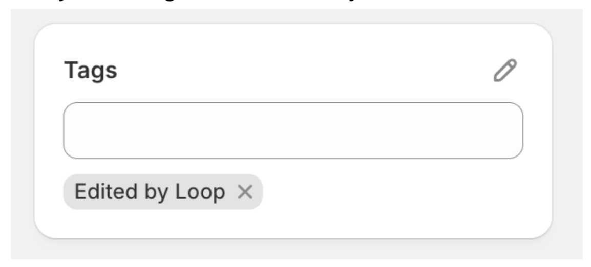 How are edits documented on the order? All edits are added to the Timeline view in Shopify. In addition an ‘Edited by Loop’ tag will automatically be added to the order for tracking purposes.