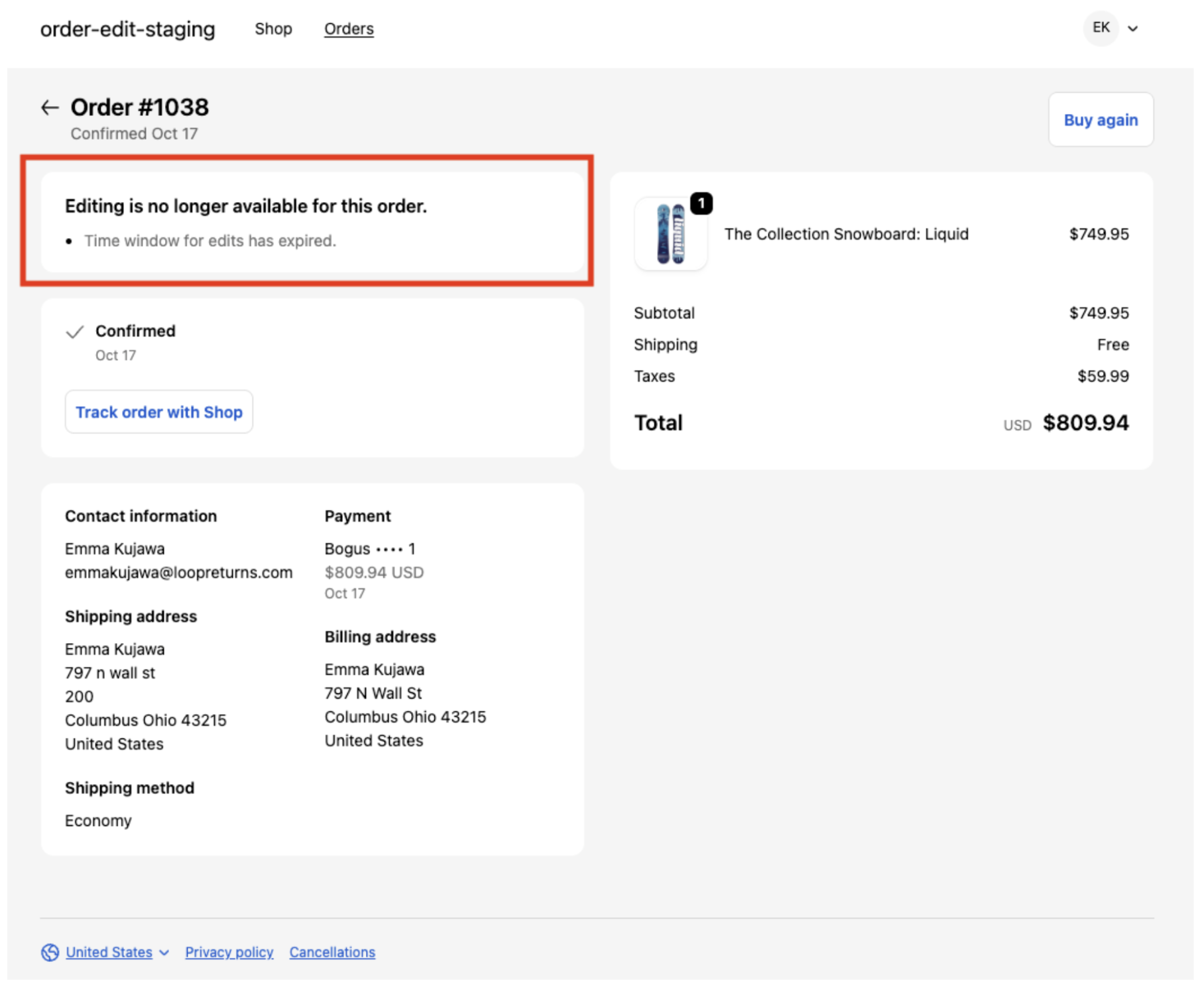 Test the editing experience and confirm your edits are successfully applied to the order in the Shopify Timeline view on the order details page