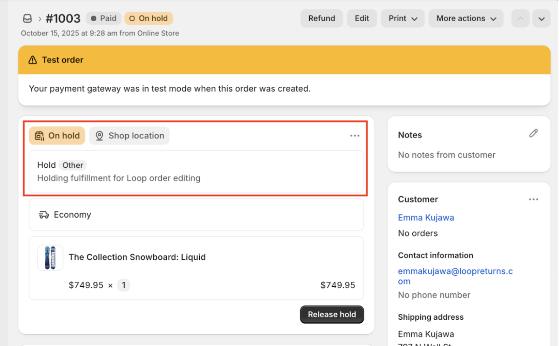 Place a test order in Shopify and verify the order has been successfully moved to ‘On Hold’ Status in Shopify