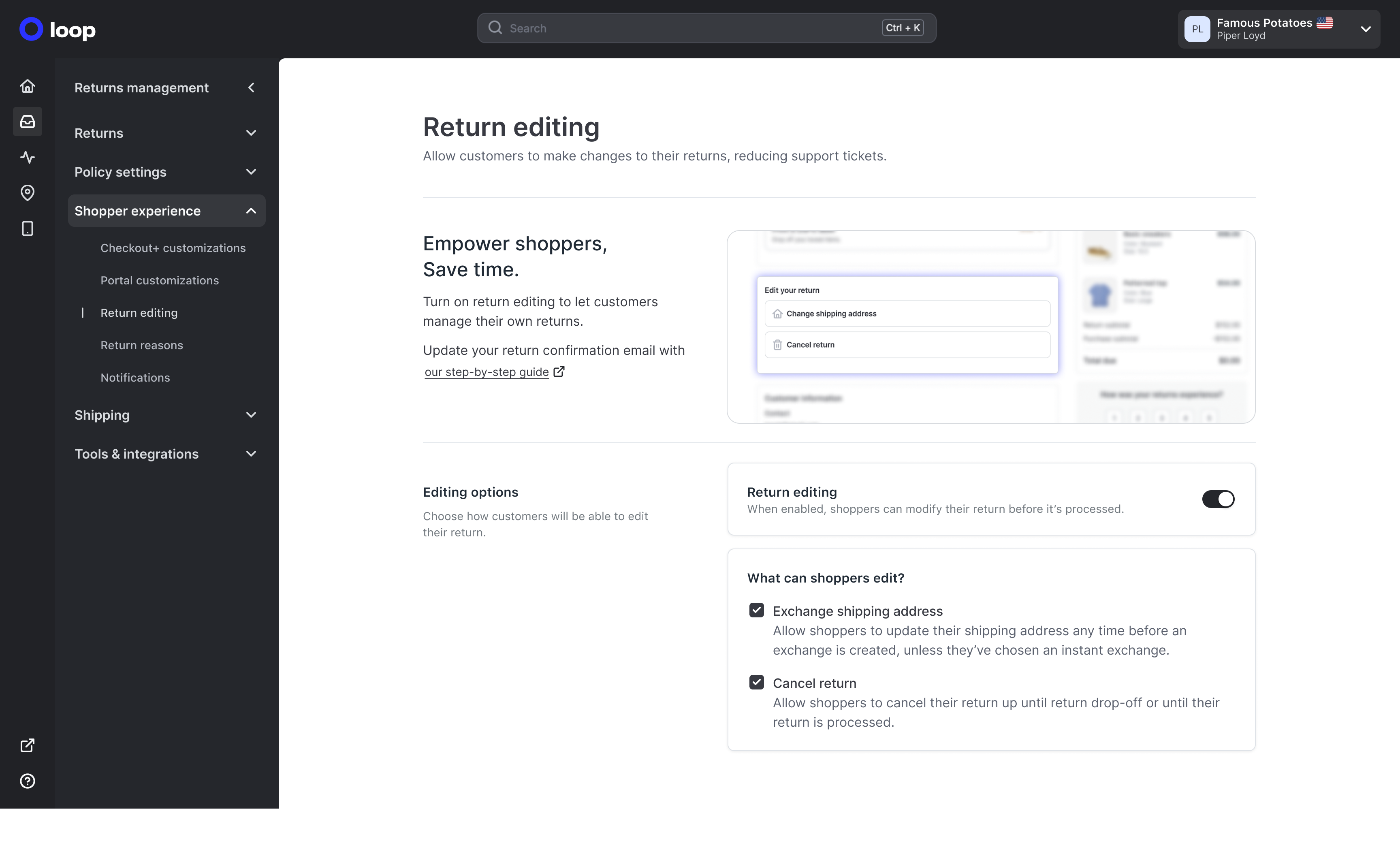 Note: This feature is automatically enabled for many shops and all new shops. You can manage these settings in your Loop admin under Shopper Experience > Return editing.
