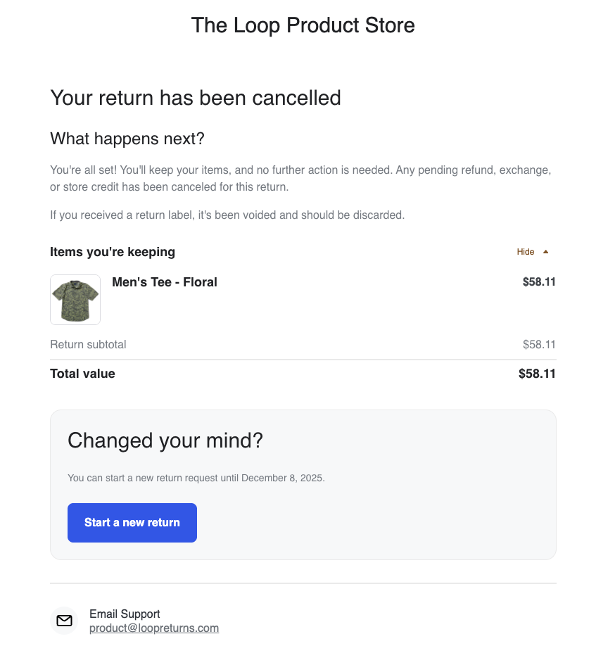 Note: Loop does not notify the merchant via email when a shopper cancels their return. Similarly, when a merchant cancels a return, Loop will not notify the shopper.