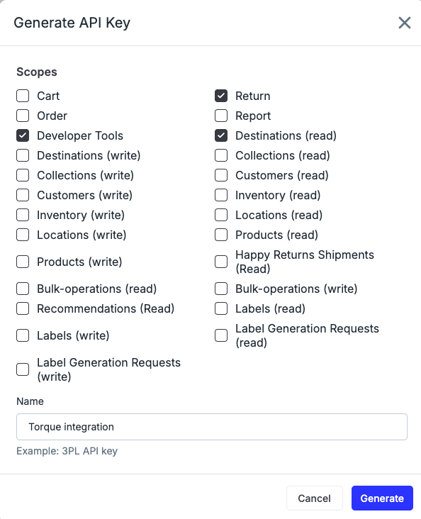 Select the scopes for: Return, Developer Tools, & Destinations (read) and name the API key “Torque integration,” This name is for your own internal labeling convenience. Click Generate to create a Loop API key.