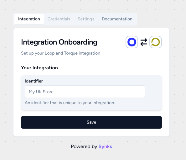 To set up this integration, you will need an API key from Loop and your Torque API key, and then input them in the Synks portal to connect. To get access to the Synks portal, please reach out to your Merchant Success Manager, Onboarding Specialist, or support@loopreturns.com.
