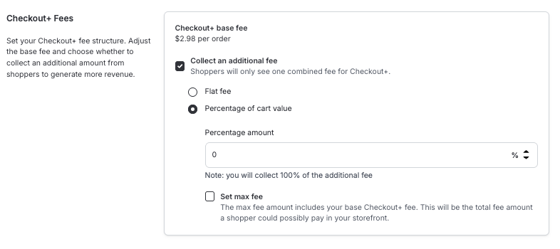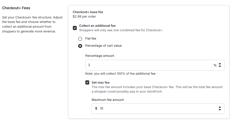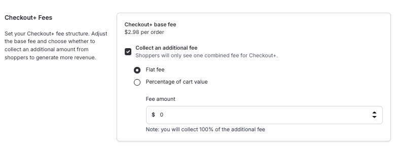When dynamic pricing is enabled, Checkout+ adds an additional fee on top of the base Checkout+ fee. Merchants can choose between: